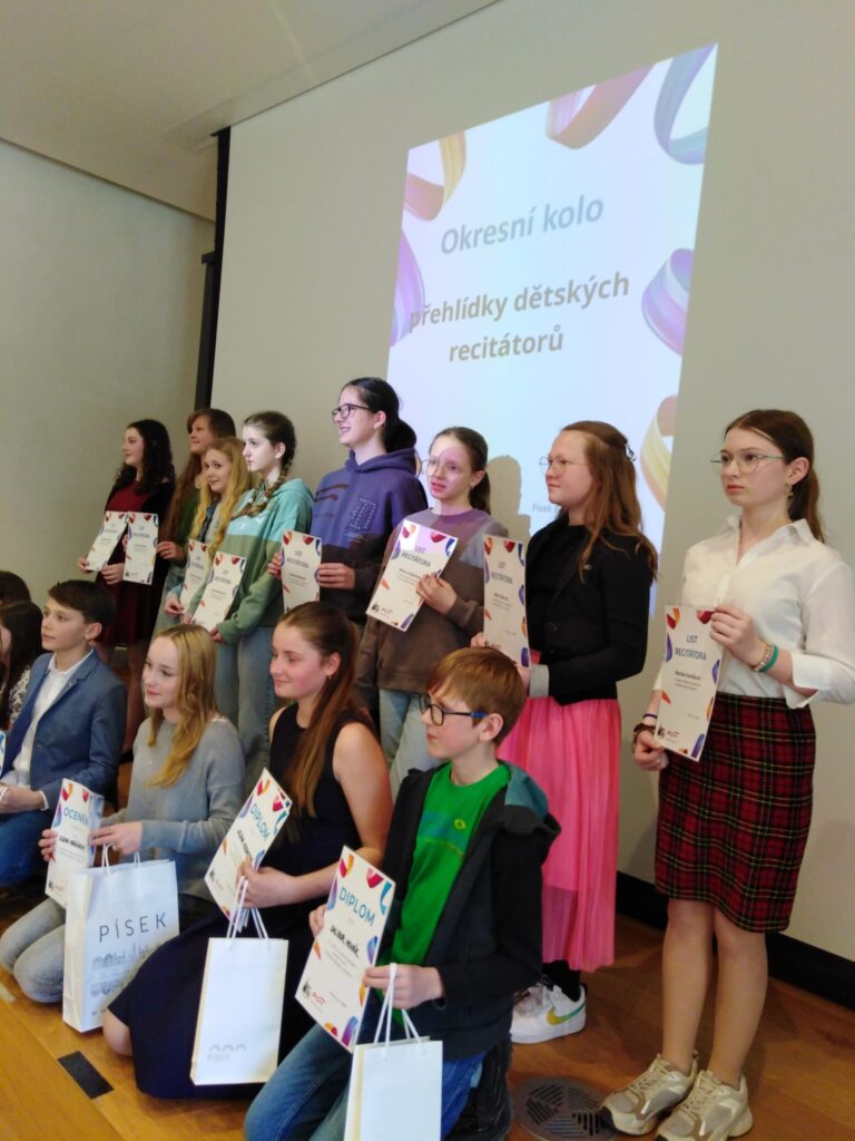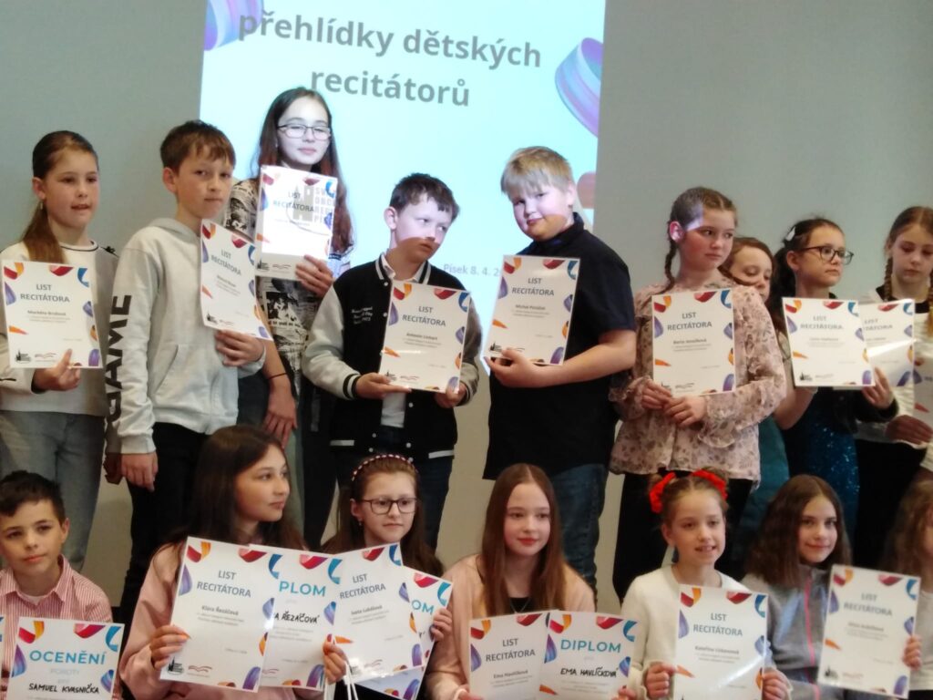 Po školním kole recitační soutěže reprezentovali vybraní žáci naši školu v okresním kole přehlídky dětských recitátorů. Vydali jsme se do Písku autobusem a prožili jsme pěkné dopoledne v písecké knihovně. Vyslechli jsme si mnoho dobře nastudovaných a zarecitovaných textů a básní. V I. kategorii soutěžil Jan Devátý ze 2. třídy s básní Františka Hrubína Perníková chaloupka. Ve II. kategorii bojovali Antonín Linhart ze 4. třídy s básní Jiřího Žáčka Na počest prvních vzduchoplavců a Michal Potůček z 5. třídy s básní Jaroslava Seiferta Petrolejová lampa. Soutěžící ve III. kategorii byla Marie Linhartová ze 6. třídy, přednesla báseň Františka Hrubína Chytrá Šahrazád.
